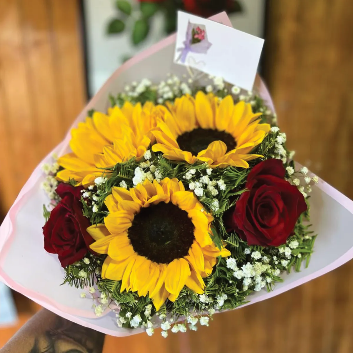 Como un abrazo de verano, este ramo mixto combina la calidez de tres girasoles con la delicadeza de dos rosas. Un detalle que ilumina y enamora.